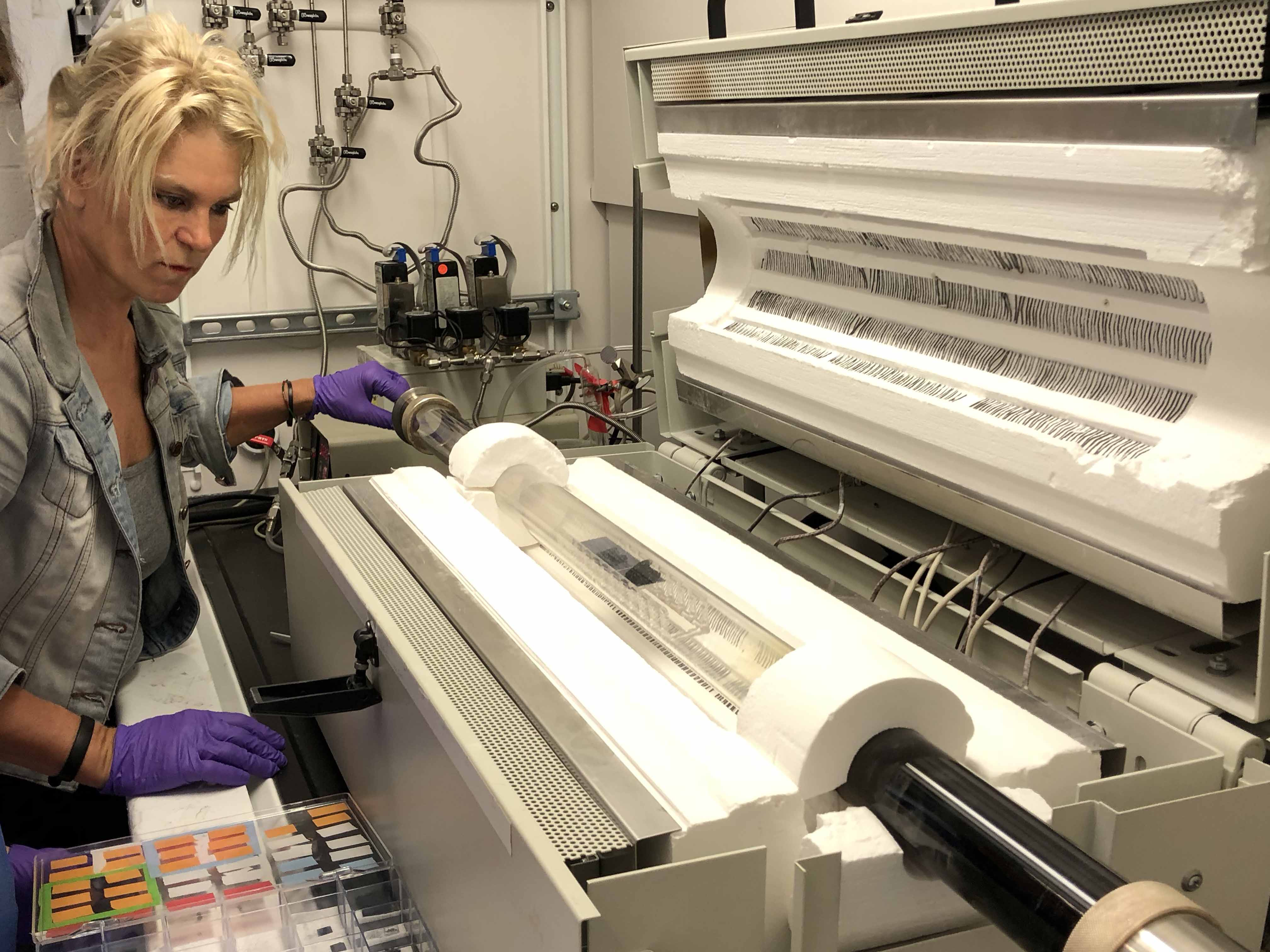 Luiz Acauan and Estelle Kalfon-Cohen inspect the diamond during removal from a processing substrate in MIT necstlab, just prior to CNT growth.