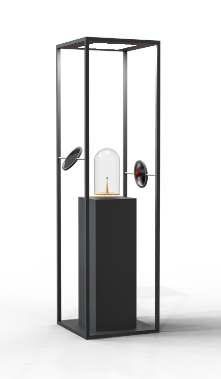 Frame: square tubes or bars 20 x 20mm; steel epoxy coating white, RAL 9010; Pedestal steel epoxy coating white, RAL 9010 Diamond display: glass dome, 250 x 350 x 5mm: Schott Duran, high transparent colorless glass; solid brass base, top gold plated: Diamond support cone, gold 18 carat; solid or 3D printed.