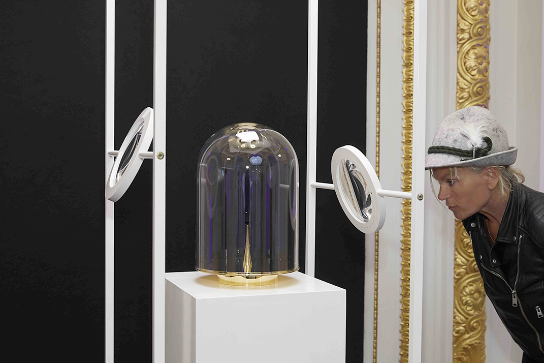 The covered diamond is presented on a small elongated golden foot encased in a safety class chamber mounted onto a pedestal. In order to be able to “see” the deprivation as efficiently as possible, the display is equipped with illuminated magnifiers. Part of the display is an armed security guard.